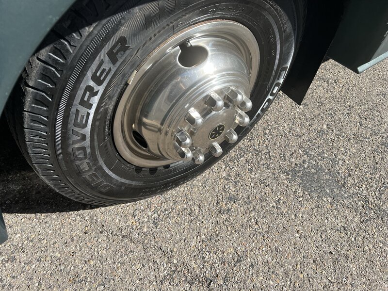 Factory-standard equipment includes the Ford motorhome chassis with a gasoline V-8 and automatic transmission, power steering and power brakes, captain’s driver and passenger seats, cruise control, tilt steering, factory stereo, and standard safety features.