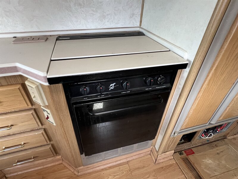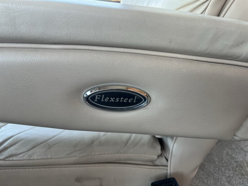 The coach was factory-equipped with a full galley (three-burner range with oven, microwave, and a 3-way refrigerator), double sink, dinette/sleeping area, full bath with shower, propane furnace and water heater, roof air conditioning, factory generator, fresh/gray/black holding tanks, exterior storage compartments, a powered awning, and built-in cabinetry and window treatments for comfortable living.