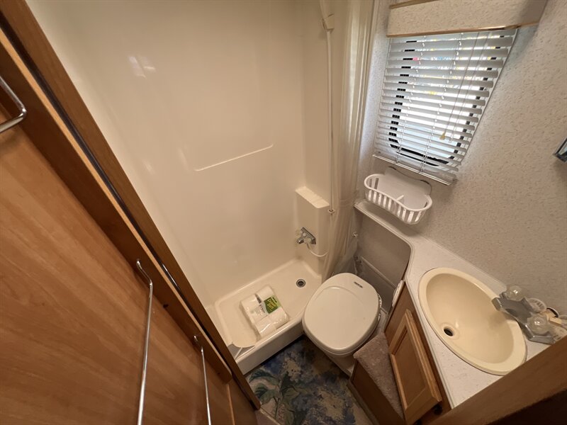 The bathroom area includes a convenient shower and toilet combination, providing privacy and comfort during your travels. The camper is also equipped with a fresh water system, ensuring you have access to clean water wherever you go.