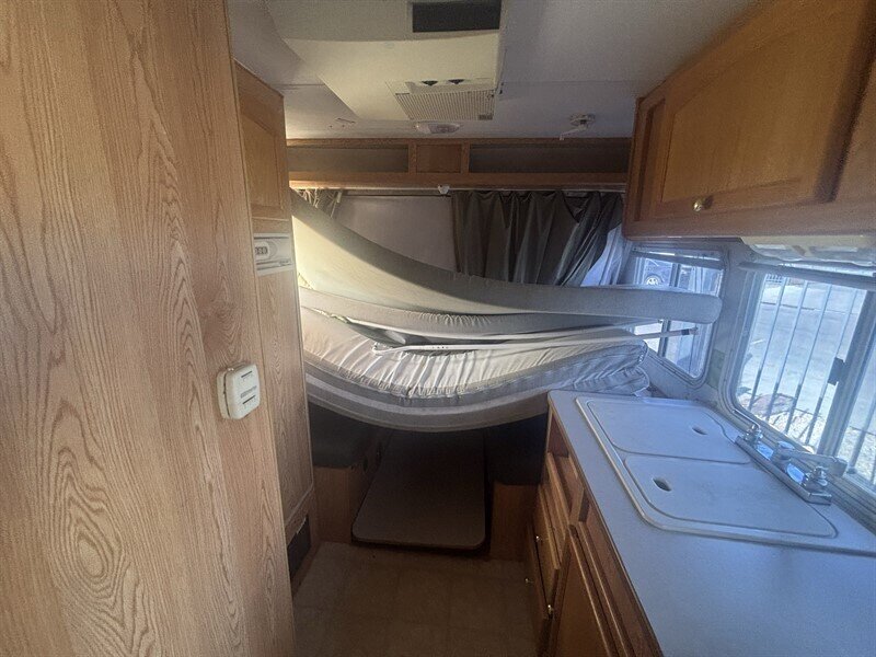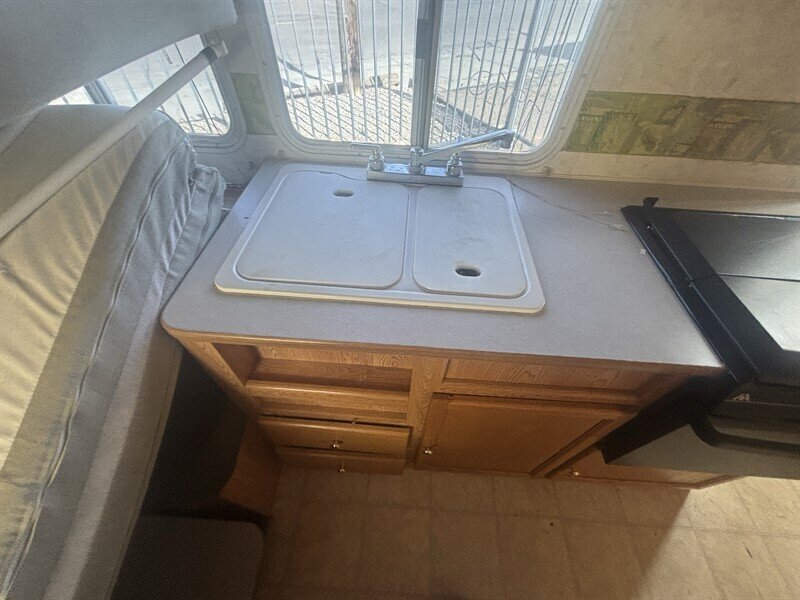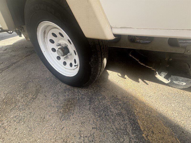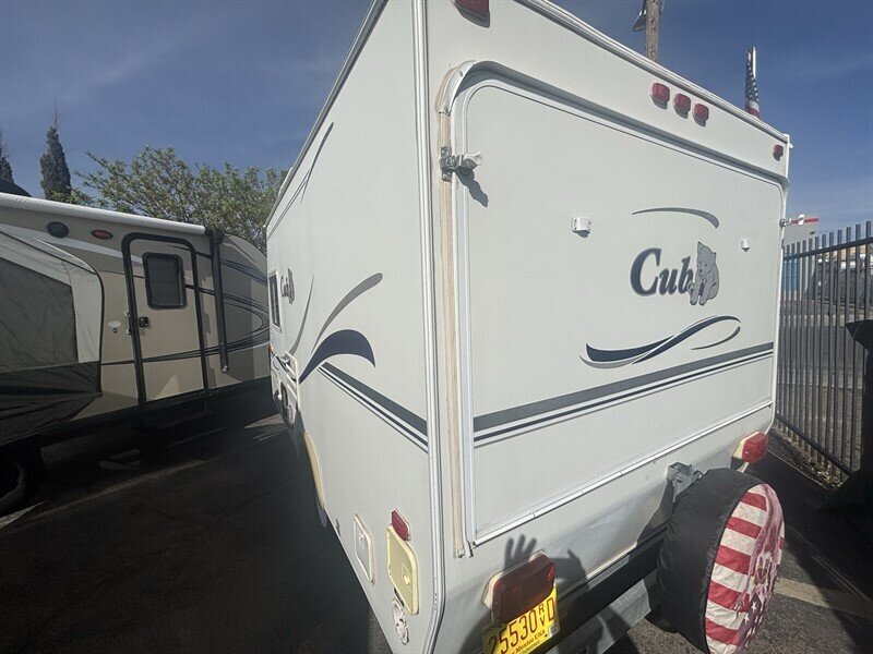2003 Aero Mfg. RV Cub Aerolite Cub 16 in white exterior with tan interior, in excellent overall condition. Factory-standard features include a lightweight, insulated aluminum-framed body with gelcoat white exterior finish; single-axle chassis with manual tongue jack and exterior diamond-plate rock guard; interior tan vinyl/upholstery and durable flooring; a compact galley with sink, two-burner propane cooktop and countertop storage; a convertible dinette/bed and overhead cabinetry for storage; enclosed wet bath or cassette-style toilet area with shower; 12V DC and 120V AC electrical systems with shore-power inlet, interior lighting and 12V battery provision; propane supply for cooking and heating, on-demand or tank water heater, and fresh/gray/black holding tanks; roof vent, screened windows with curtains, smoke/CO detectors and basic exterior lighting.