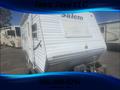 2006 Salem 19FD SALEM LE — white exterior, tan interior, excellent overall condition. Factory equipment includes a compact living area with convertible dinette and dedicated sleeping space; a galley with range, microwave, 3-way refrigerator, stainless sink and overhead cabinetry; and a full bath with shower. Comfort and utility items include furnace and water heater (LP), roof air vent and factory-installed A/C provision, 12V electrical system with converter, battery and 30-amp shore power hookup, interior lighting, window blinds and vinyl flooring. Exterior features supplied from the factory include a white fiberglass/gelcoat exterior, manual entry steps, exterior storage access, stabilizer jacks and a manual awning. Standard safety and convenience items include smoke and LP gas detectors and a fire extinguisher.
