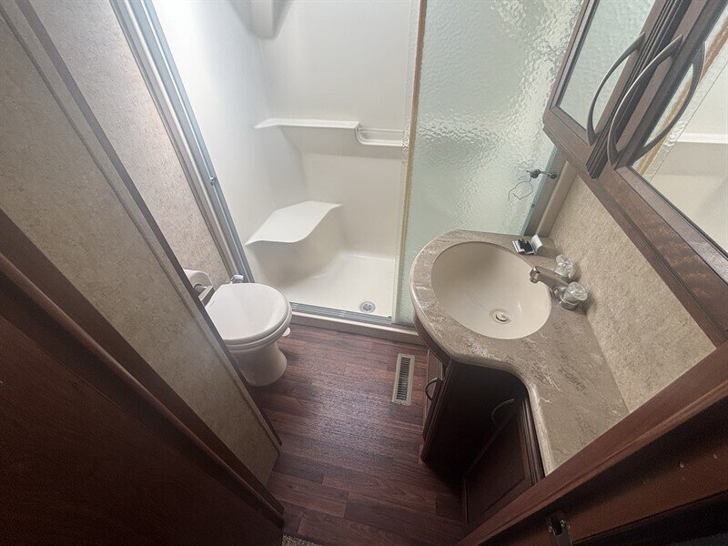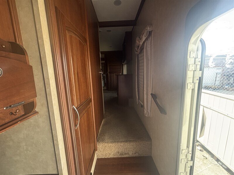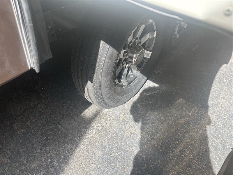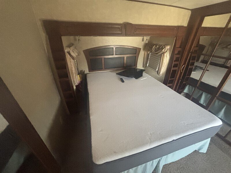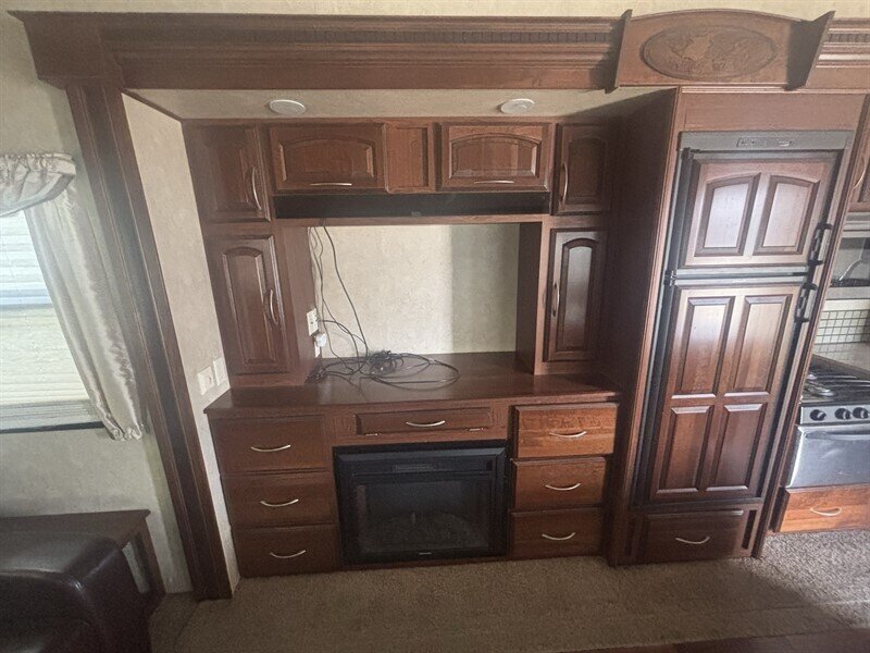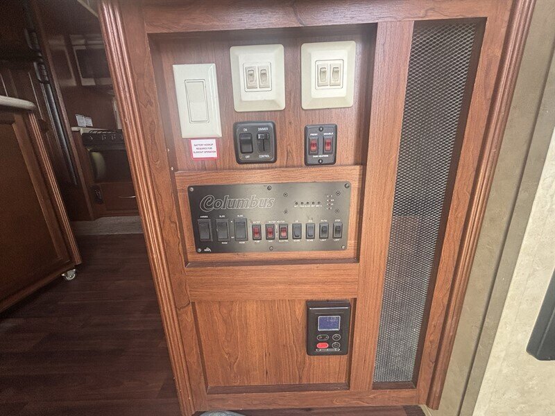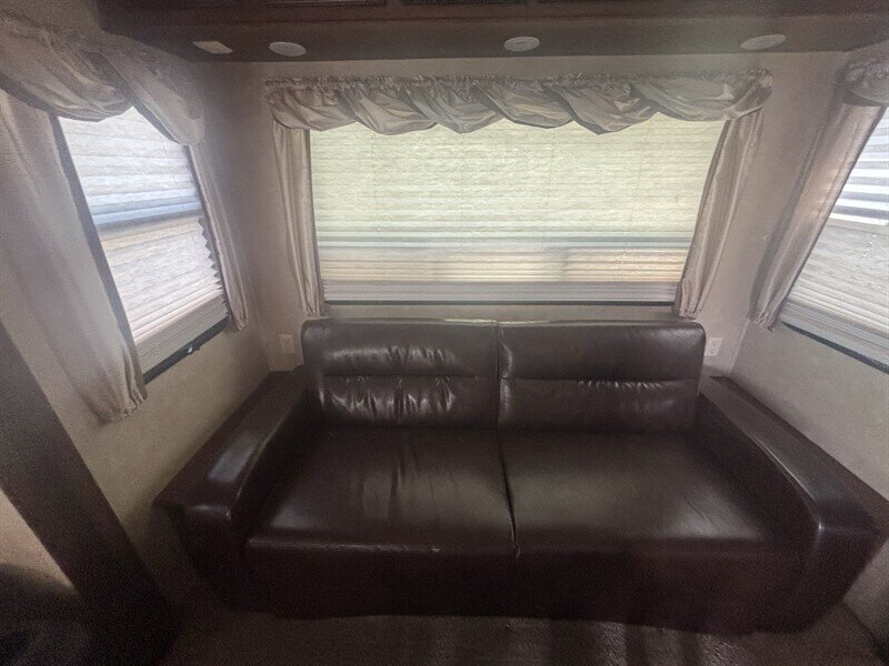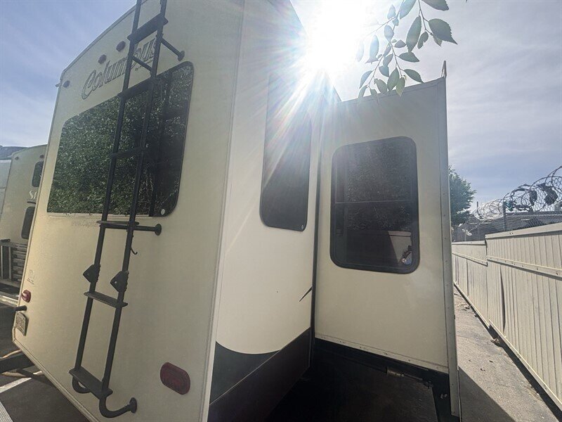 2013 Palomino Columbus 320RL fifth-wheel in tan exterior with brown interior, presented in excellent overall condition. Factory-equipped with a residential-style kitchen including a three-burner range and oven, microwave, full-height refrigerator, solid-surface countertops and abundant hardwood cabinetry. The interior layout features a rear living area with comfortable seating and an entertainment center with fireplace prep, a well-appointed master bedroom with factory bed and wardrobe storage, plus a full bathroom with a shower and skylight. Standard factory systems include a roof-mounted air conditioner, forced-air furnace, 12V/120V electrical system with converter and battery prep, power awning, exterior storage compartments and factory-installed slide-outs for increased living space.