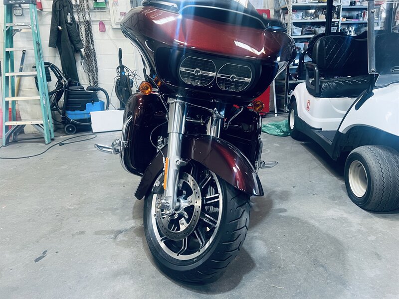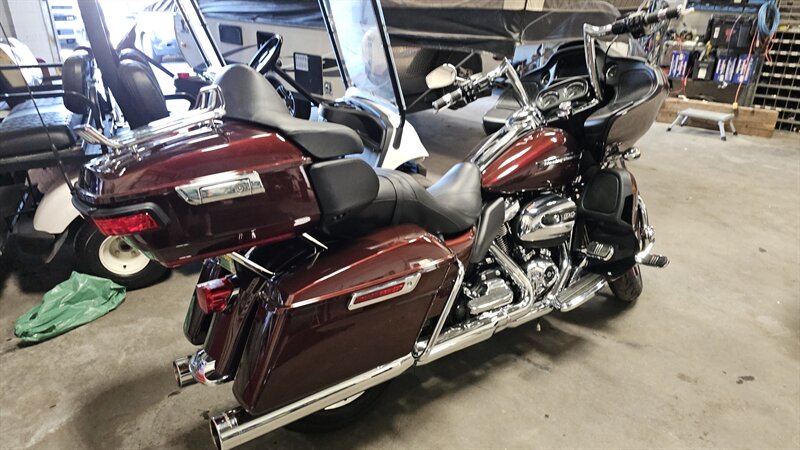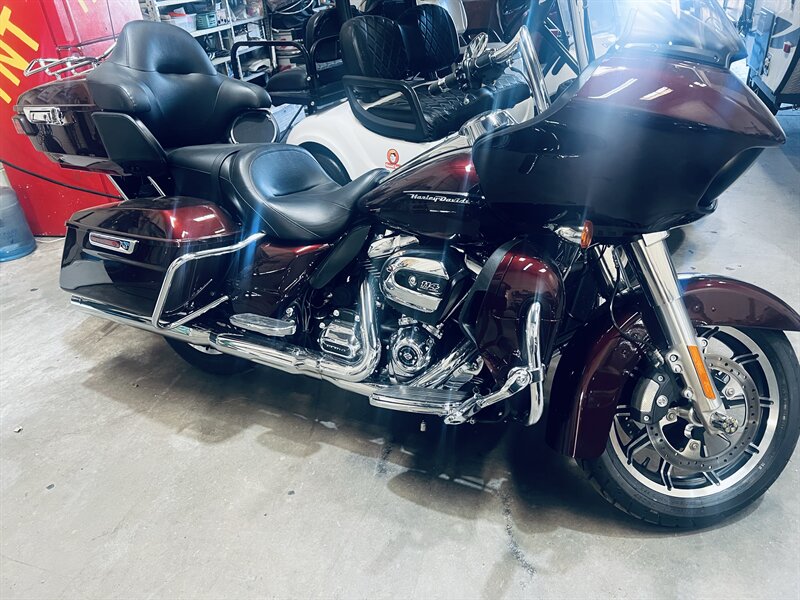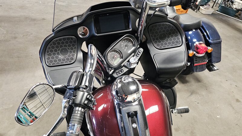 2019 Harley-Davidson Road Glide S in Merlow with a Black interior. Factory-installed equipment includes the Milwaukee-Eight 114 V-twin engine paired to a six-speed Cruise Drive transmission, frame-mounted shark-nose fairing with dual headlamps, factory audio and instrument cluster, lockable hard saddlebags, touring-oriented seat and wind protection, electronic cruise control, ABS with linked braking and touring-tuned suspension. Mileage is under 9,000 miles (averaging less than 2,000 miles per year) and the bike is in excellent overall condition.